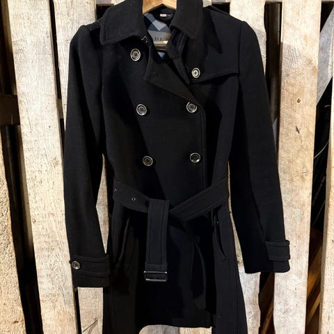 Takki on muuten moitteettomassa kunnossa ja lämmin mutta yhdessä taskussa (vasen tasku) ja sen vieressä sivulla kulumaa. Lisäksi takin molemmissa hihoissa myös kulumaa. Kyseessä vain pintakulumat, jossa musta villapinta vain lähtenyt, alla näkyy Burberryn klassinen kuosi. Ompelija osaisi korjata nämä näppärästi.