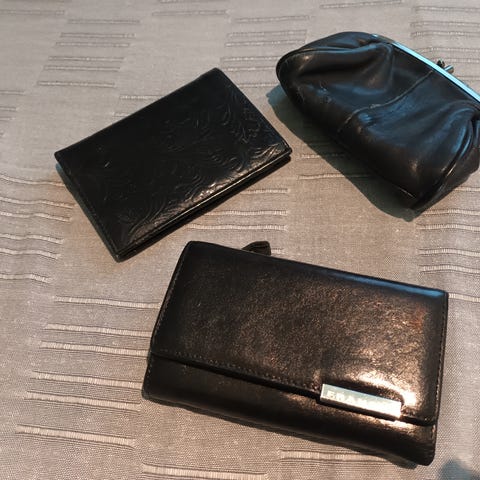 Vanhoja lompakoita kaikki hintaan 25e tai sitten voit tehdä tarjouksen jos haluaisit vaan jonkun tietyn. Nahkakukkaro, mummomalli lompakko, kolikot