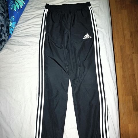 Adidaksen tummansiniset 164 cm ulkoilu/tuulipuvunhousut kevyellä verkkovuorella. Vyötäröllä kiristysnauhat. Suorat lahkeet, lahkeissa n. 20 cm vetoketjut.
