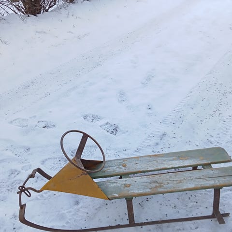 Punainen kelkka jalaksilla ja renkailla.