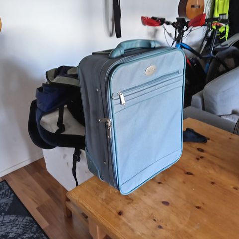 Tumman vihreä vetokahvalla varustettu nelipyöräinen matkalaukku. 2 isompaa pyörää, 2 pienempää, toimivat. Avain on, numerolukko poistettu. Siisti, normaaleja käytön jälkiä ulkopinnassa. Mitat 56x43x20.