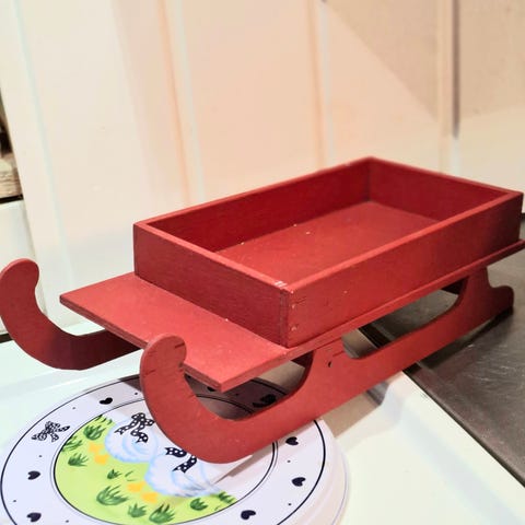 Myynnissä kuvien ehjät kelkat nukeille / tontuille. Pienemmän mitat ovat: leveys 46 cm, syvyys 10 cm sekä korkeus 20,5 cm, sen hinta on 18 e.