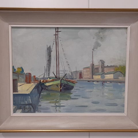 Tomasin öljyvärityö "Venesatama". Työn korkeus on 54 cm ja leveys 39 cm. Kehys 64 X 48 cm.