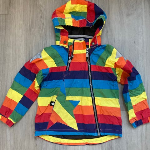 Molon oranssi välikausitakki koko 116. Jonkin verran värjäytymää ja selässä pieni viilto kankaassa. Vielä kuitenkin ihan käyttökelpoinen takki pihaleikkeihin.