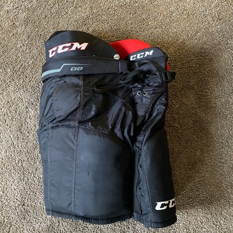CCM jääkiekkohousut, siniset, koko SR M, vyö puuttuu, käytön jälkeä ja ratkeamia/reikiäkin löytyy, mutta suojaa ok