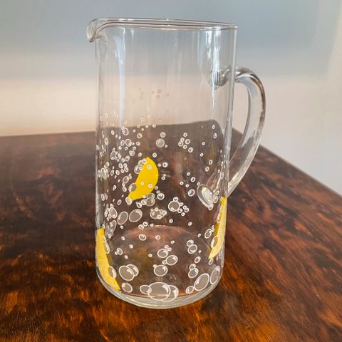 Kuvien vanha kotimainen hiottu lasikannu. Etsattu. Korkeus on noin 18 cm.