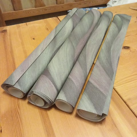 Tapetoinnista yksi yli jäänyt rulla ja vähän toista rullaa jäljellä. Kuva valmiista seinästä. Helppo tapetoida, ei ole mikään lurvake. Leveys 0,53 cm, rullan pituus 10,05 cm. Kuviokohdistus 64 cm (vuorokohdistus).