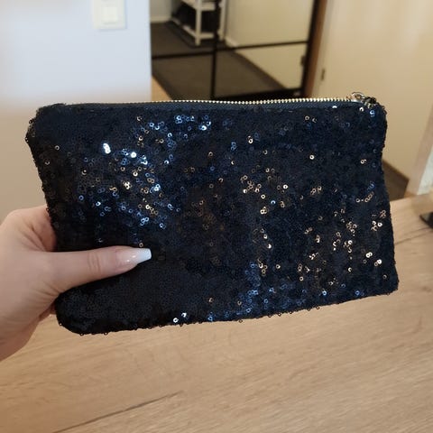 Tämä on ihana näyttävä kevyesti topattu " lompakko " kaikkeen menoon, minimini "käsilaukku", johon mahtuu juuri ne kaikkein tärkeimmät. Napakka hopeapaljetti kansi ja satiininen takaosa ja vuoritettu sisältä.