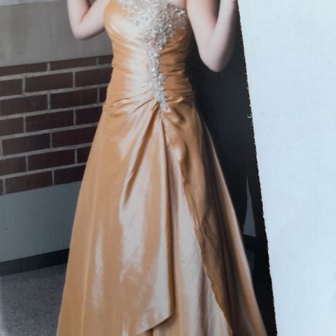 Beige timantein koristeltu mekko, koko ~M (kuvassa 172cm tyttö). Muutama timantti irronnut, mutta tuunaamalla kaunis mekko käyttöön.