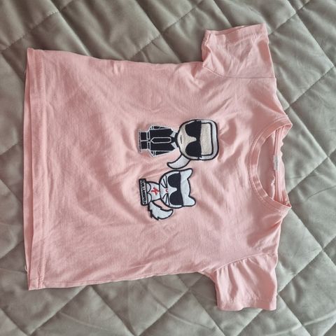 Hyväkuntoinen punavalkoraidallinen t-paita, Tutta. Kokolappua ei enää ole, mutta vastaa muita meidän 104-koon vaatteita. Paidan eteen kiinnitetty lapsen pyynnöstä ompelemalla Muumimamma-ompelumerkki.