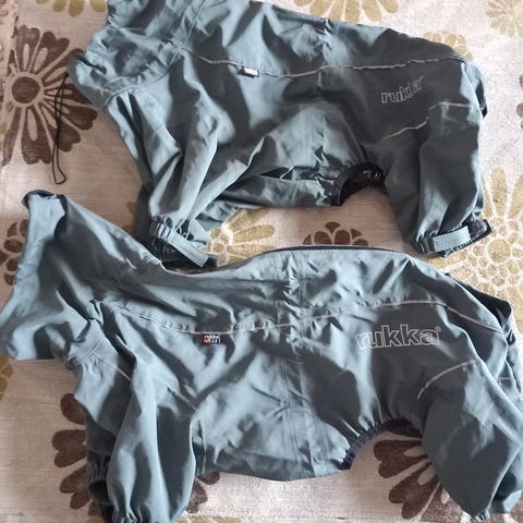 Rukka -merkin musta koiran sadeasu. Jalkoihin asti ulottava suoja. Suojaa hyvin myös kaulaa ja niskaa. Selästä kokonaan avattava. Selässä erillinen luukku hihnalle.