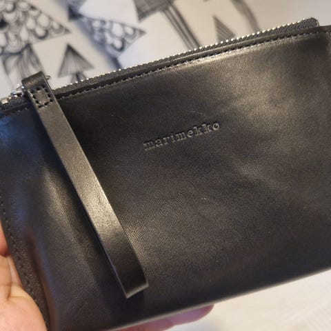 Marimekon musta nahkainen pussukka Unikko-kohokuvioinnilla. Siisti kunto, ollut vähäisellä käytöllä.