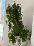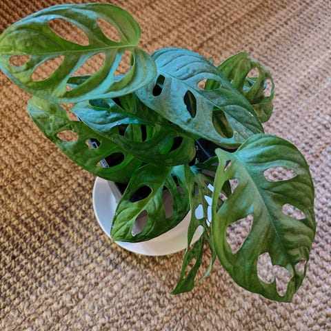 Aarnipeikonlehti (Monstera adansonii) altakasteluruukussaan (halk. 26cm). Kasvilla on kookoskuitu-tuki, jonka ympärille pitkiä varsia kiedottu. Multa vaihdettu toissavuonna, tukivartta pitäisi tukea lisää, nyt hieman vinossa.