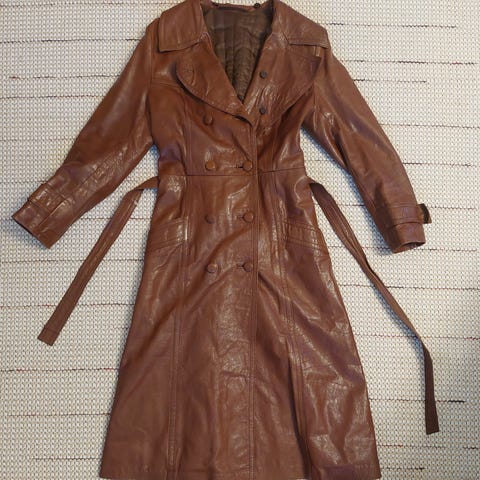 Suomalaisen Oy L Keravuoren valmistama hyväkuntoinen konjakin värinen/kirkas ruskea tyköistuva pitkä nahkatakki. Kokolapussa lukee 42 mutta todellinen koko 38-40.