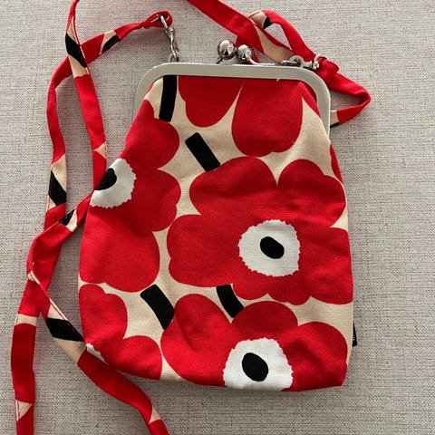 Myydään vähälle käytölle jäänyt Marimekon kukkarolaukku. Kuviossa vaaleanpunainen tausta ja tummanvihreä unikko.