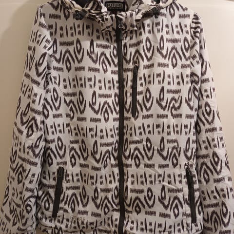 9-10. valkoinen takki hupulla, pitää hieman kosteutta mutta ei kuitenkaan sadetakki,hihoissa napit käärintää varten koko:M 10eur