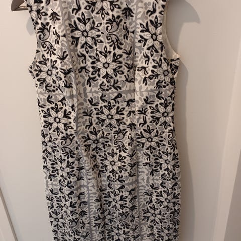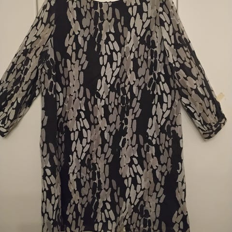 Hyväkuntoinen Marimekon Kivikausi -mekko, jämäkkää joustamatonta kangasta. Helman pituus n. puoleenväliin reittiä, hihat 3/4 pituiset.
