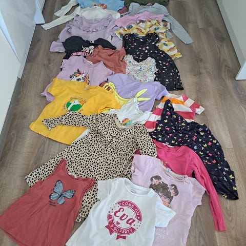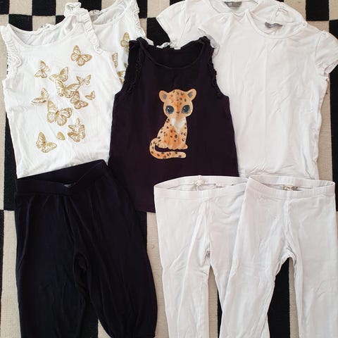 - DKNY & Lucky No.7 122 kokoa vastaavat t-paidat: DKNY paidat paljon käytetty. Valkoisessa tummumaa ja printti hieman kulunut ja harmaassa samoin printti kulunut, jonka lisäksi haalistunut ja pyörällä kaatumisesta tullut vatsaan reiät. Vaatelaastarilla varmaan saisi vielä ihan siistiksi. Lucky No.7 siisti, joskin hieman haalistunut.