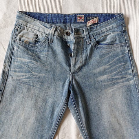 Siistit ja ehjät farkut. Edessä napit. Vihreä sävyiset.