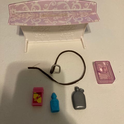 Joukko tavaroita Barbien kokoisille nukeille: musta vanhanaikainen kännykkä/ radiopuhelin, keltainen/ vaaleanpunainen puuterihuisku, jossa oikeat harjakset, sekä vaaleanpunainen vauvan helistin. Erittäin hyväkuntoisia.