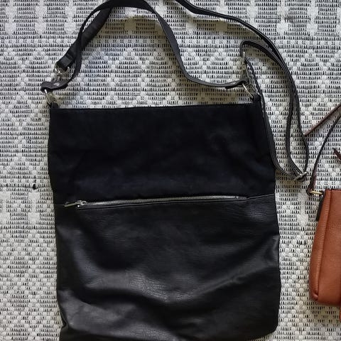 Keinonahkainen hyväkuntoinen laukku, kassi. Korkeus 38 cm. Leveys 44 cm. Sisätaskulla.