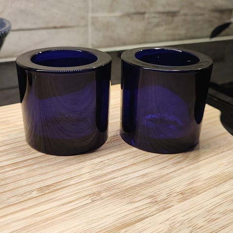 Iittala/Marimekko koboltinsininen ja kirkas lasi tuikku, yhteishintaan 16 euroa.