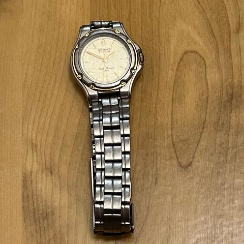 Kaunis hopeinen Orient rannekello. Toimii, vaatii uuden patterin