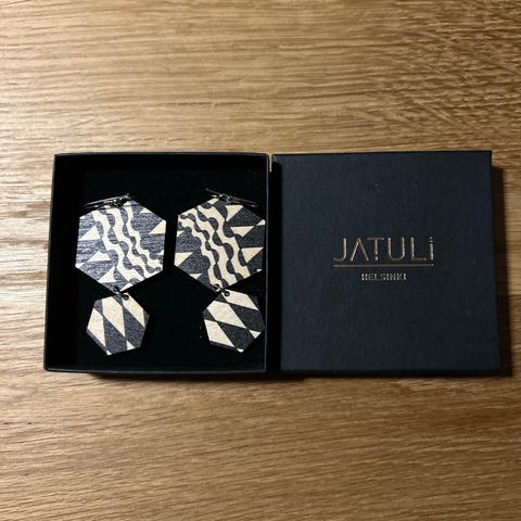 Myydään hyväkuntoiset, vähällä käytöllä olleet Jatuli -merkin koivuvaneriset korvakorut. Säilytetty merkin omassa säilytysrasiassa (kuuluu kauppaan). Kyseisiä korvakoruja Jatuli ei enää valmista.