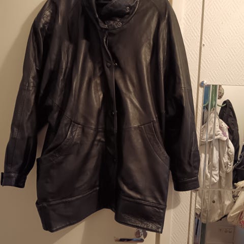 Muuten erittäin siistissä kunnossa oleva nahkatakki (pehmeää nahkaa), mutta yksi nappi vaatii parempaa kiinnittämistä. Takissa on olkatoppaukset (niiden poistamisen mahdollisuutta en osaa sanoa)