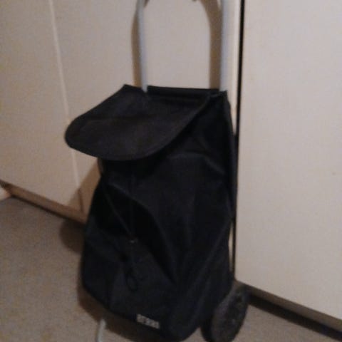Tilava ostoskärry. Säädettävä vetoaisa. Hyväkuntoinen, siisti. Materiaali: muovitettu tekstilli. Nouto Espoosta Latokaski
