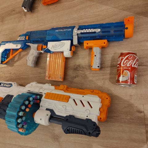 Poika laittaa leikkipyssyt kiertoon. Nerf merkkisiä 8kpl, muut vastaavia kopioita. Kaikki toimii, mutta panokset mennyt hukkaan ja pikkupussystä puuttuu lipas. Ison fortnite pyssyn latausjuttu on lainattu Elite pyssyyn, molempia siis voi käyttää kun vaihtaa aseesta toiseen... Iso osa kuin uusia. Esim Ultra pyssy maksoi päälle satasen ja vissiin kertaalleen leikitty.