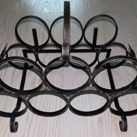 Viinipulloteline, johon mahtuu 11 pulloa. On jotain rautaa/metallia, tukeva, hieman painava. Kantokahva. Yhdestä jalasta irronnut muovitassu matkan varrella.
