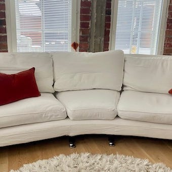 Float-sohva on verhoiltu vaalealla eläväpintaisella Munster 20-vakosamettikankaalla.