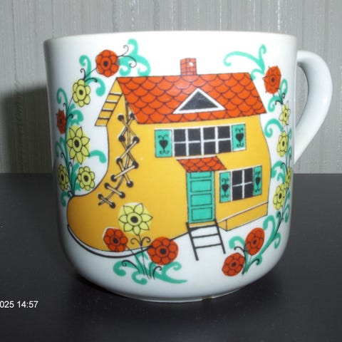 Myydään kuvien mukainen suloinen Satukenkä-muki. Suunnitellut Raija Uosikkinen. Satukenkä-mukia on valmistettu vuosina 1962-1972.
