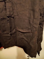 Kiinalaistyylinen takki vuorella, sivuissa halkiot. Materiaali tuntuu pellavalta, vuoren kangasta en tunnista. Koko ehkä M, 38 - 40. Hyvä, käytetty kunto. Silitys jää ostajalle.
