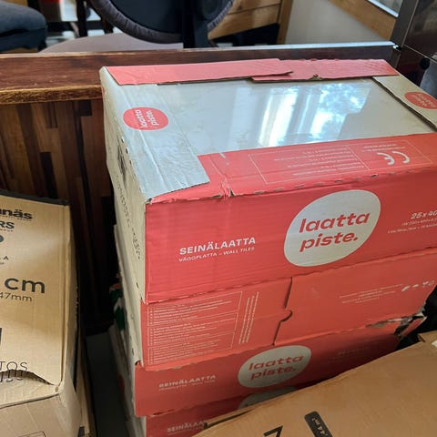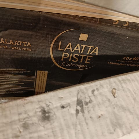 Uusia Laattaleevin seinälaattoja vajaa paketti, 6 kappaletta ja reilu puolikas, sekä muutama pienempi pala. Koko 25x75cm ja paksuus 10mm. Kiiltävä valkoinen. Laatta, kaakeli.