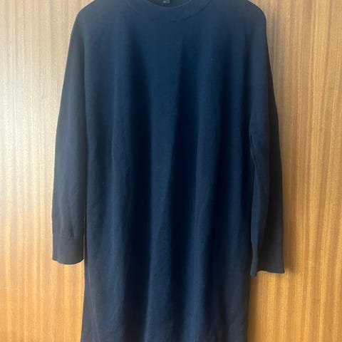 Cos L-kokoinen harma neulemekko. Puuvilla ja villan sekoitusta. Kai-kai noin 63cm, niskasta helmaan noin 90cm. Mekossa hieman nukkaa.