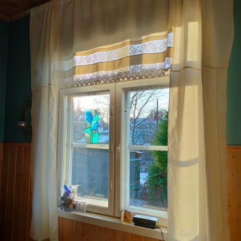 Vintagea, maalaisromantiikaa..hempeän roosat verhot tankokujalla.