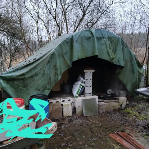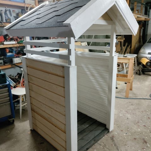 Jätesäiliön suojakatos. Voi käyttää puutarhatyökalujen tai klapien varastoksi. Pontattu vuorilauta, ulkokehikko ja tiilikuvioinen peltikatto. Leveys 220 cm...korkeus 170 cm ja syvyys 115 cm. Voin tarvittaessa kuljettaa ostalle, kunhan määränpäässä on 400 kg nostovoimaa. Kuljetuksesta ajokilometrien mukaan.