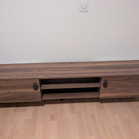 Myydään painava, ei mikään rimpula tv-taso ruskea-valkoinen. Leveys 170cm, korkeus 48cm, syvyys 45cm.