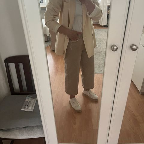 Sininen, hieman ehkä harmaaseen taittuva villa-silkki-polyesteri sekoitteinen kangas, jossa vaaleita pilkkuja. Istuu todella hyvin. Olen kokoa 36-38 ja on aivan nappi. Menee hyvin pienelle 38. Malli on vanhempaa 80-90-lukua. Kangas on kevyt ja sopii kesään hyvin. Vuori asetaattia.