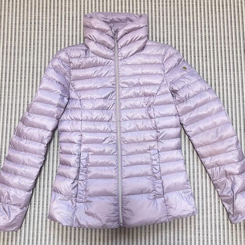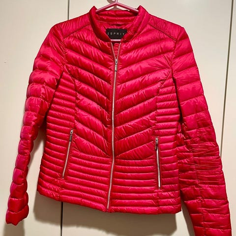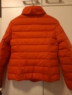 Kevytuntuvatakki Esprit oranssi S. Täyte 95% untuva. Sisällä fuksian värinen vuori. Erittäin kevyt ja vie vähän tilaa. Kauluksen alla on kääritty huppu ( näkyy kuvasta). Mitat: kai- kai 50 cm. pituus 58 cm. Hihan pituus olkasaumasta hihansuuhun 62,5 cm