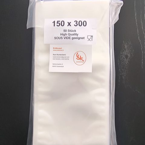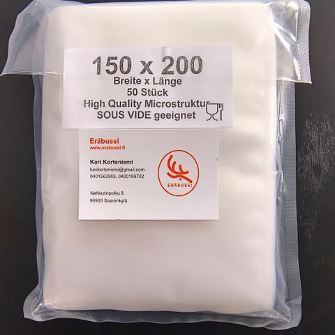 Microuritettu vakuumipussi 100 x 150, vahvuus 90my. Markkinoiden paras vakuumipussi tyytyväisyys takuulla, jos et ole tyytyväinen niin silloin rahat palutetaan! Microuritettu vetää ilmat pois nopeammin ja paketista tulee tiiviimpi. Löytyy myös vahvempaa 160 my pussia ja muita kokoja n. 50 kpl. Pienin 80 x 100 mm ja suurin 700 x 1000. Rullat 15, 20, 22, 25, 28, 30 ,35 ja 40 cm vahvuuksilla 90 ja 160 my