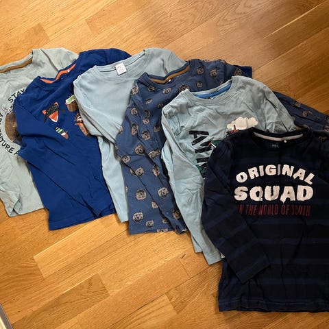 23 kpl pitkähihaisia paitoja. Koot vaihtelee 116-128cm. Meillä pidetty 4-5 -vuotiaalla pitkällä pojalla. Oikein hyvää perus käyttövaatetta päiväkotiin tms. seuraavalle. Osassa värit hieman haalentuneet ja parissa enemmän nukkaa.