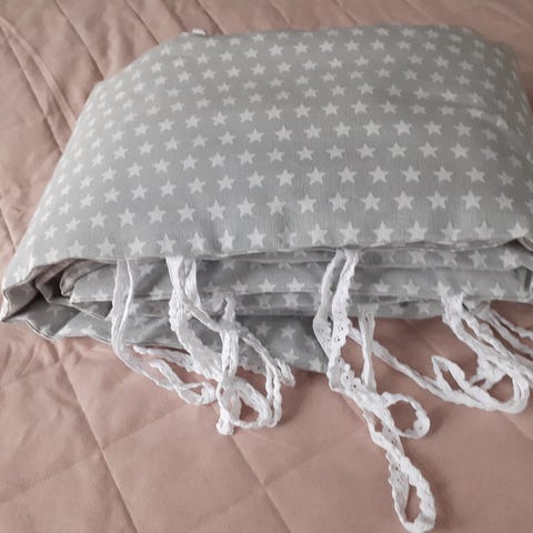Pinnasängyn reunapehmuste. Hyvässä kunnossa. Valkoinen, harmaa ja vaaleanruskea väri