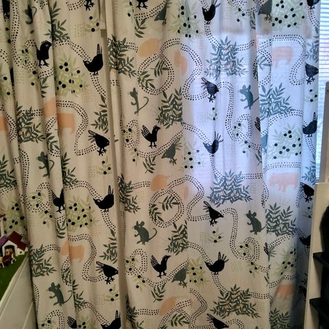 Vähällä käytöllä olleita lehmä - verhoja, nyt olleet kaapissa, ovat hieman rypyssä, joten kaipaavat silitystä. Muuten ovat siistikuntoisia.