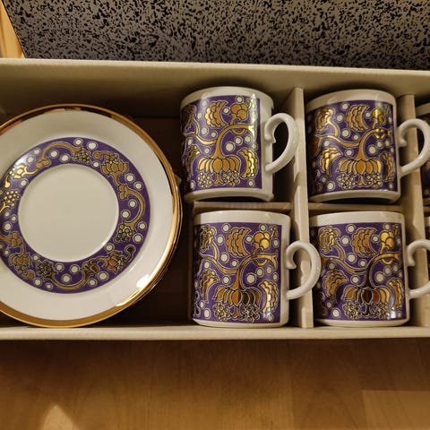 Arabia Iiris mokkakuppi Lila, desing Anja Jaatinen-Winquist. Kupin korkeus 6cm, halkaisija 5,5cm, Lautasen halkaisija 11,5cm. Nouto tai postikulut ostajalle. Toridiili ei käytössä.