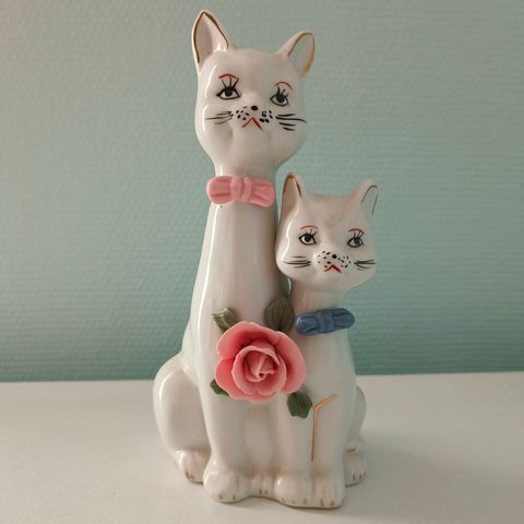 Kissaystävykset figuuri menneiltä vuosikymmeniltä. Valk. posliini koristekultauksin. Korkeus 10 ja leveys 65cm. Korvat saaneet takaa osumaa (ks kuva takaa) ei näy edestä.