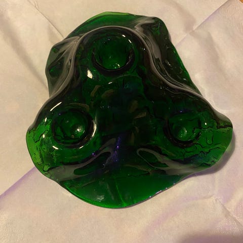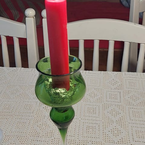 Korkea kynttilänjalka, kellertävää lasia, kuplia. Hienokuntoinen.