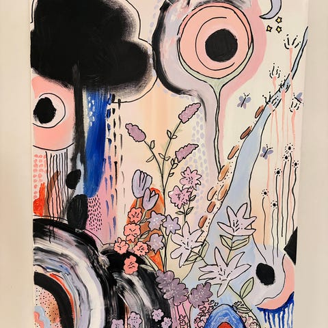 Myydään iso akryylimaalaus valkoisessa puukehyksessä. Korkeus 80 cm